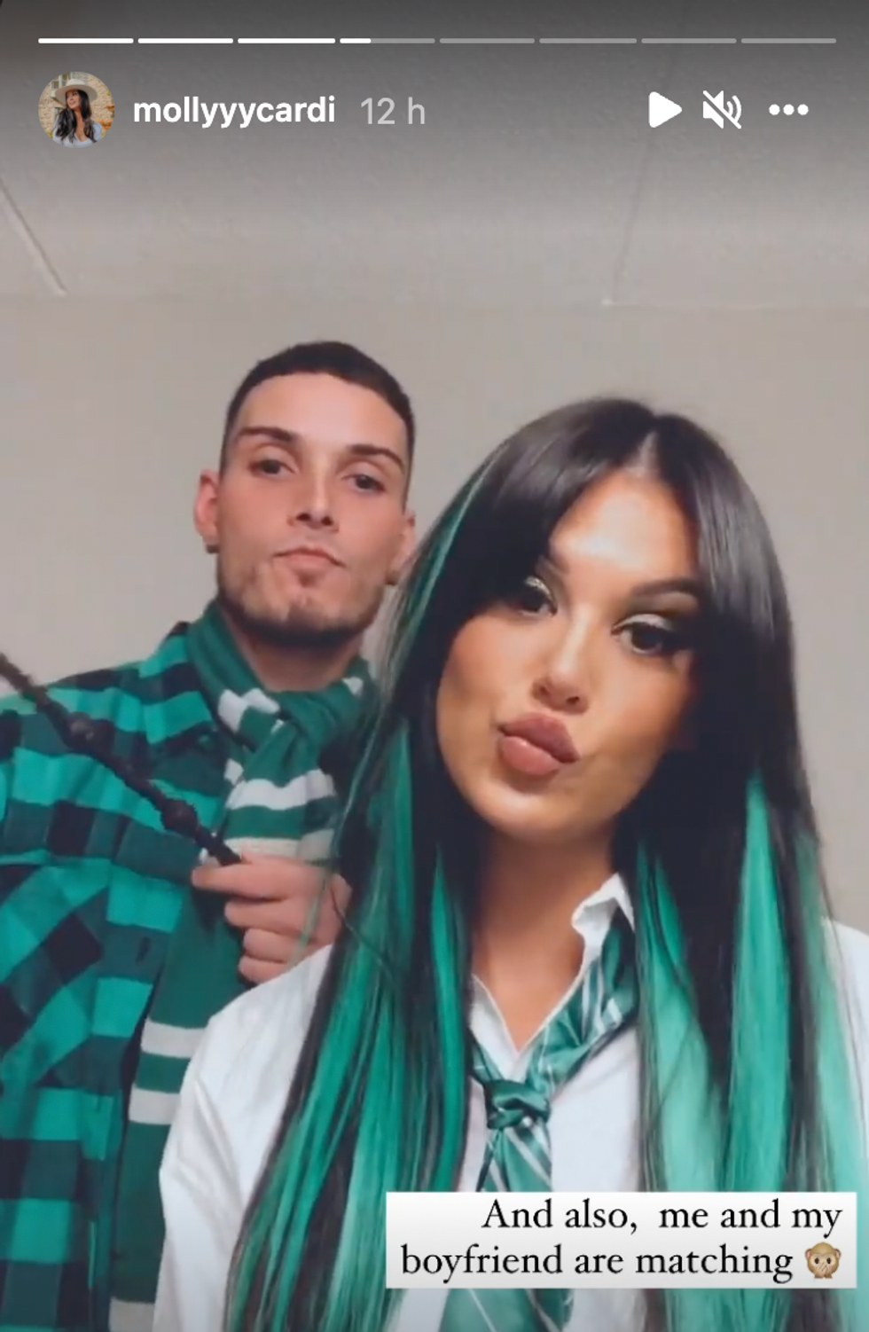 Pour une soirée d'Halloween, son copain et elle ont enfilé des matching outfits d'étudiant.es de la maison Serpentard inspirés de la saga Harry Potter, et elle en a profité pour faire la grande annonce.