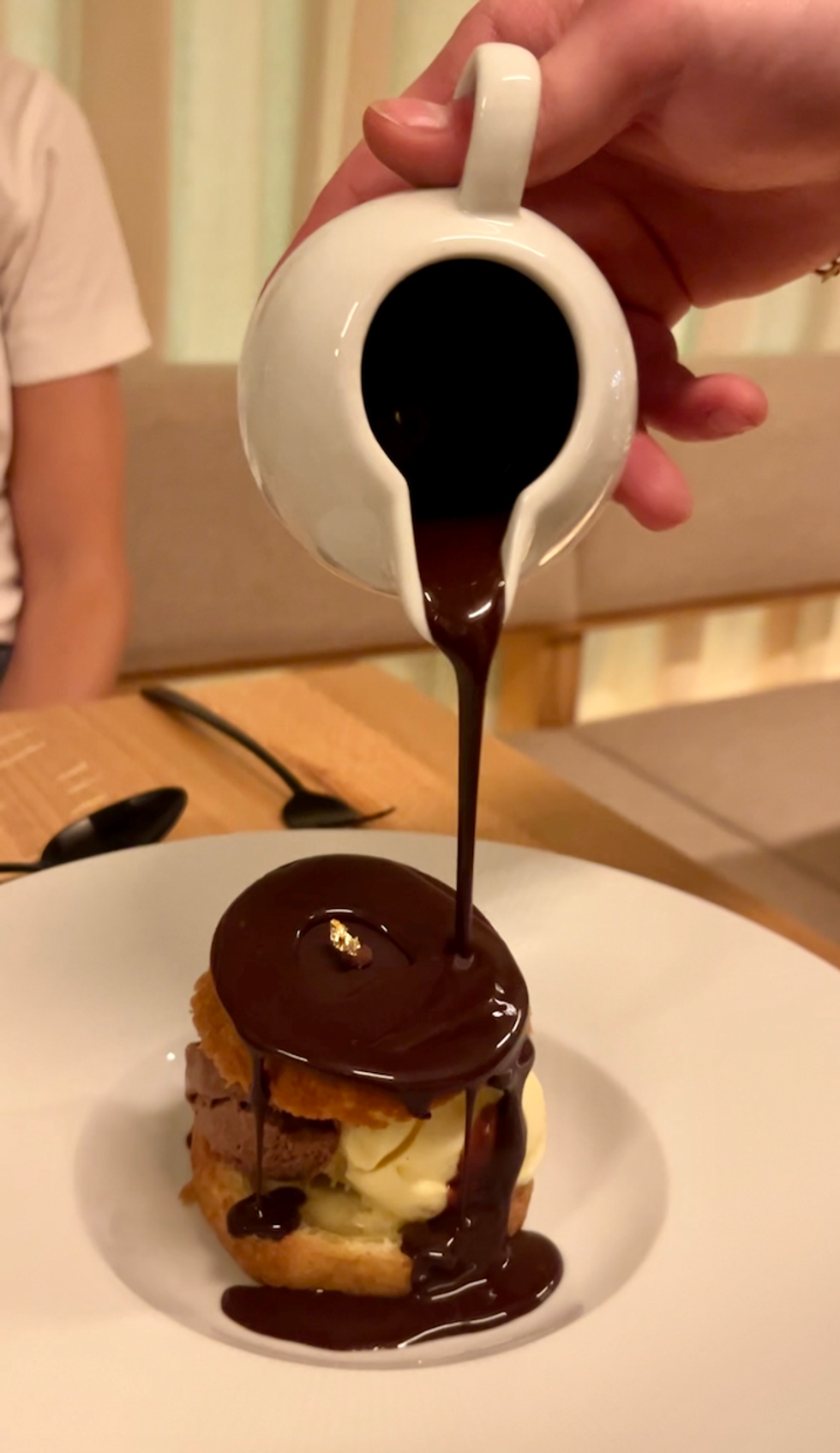 Même si tous les plats du menu risquent de te faire de l'oeil, tu dois garder de la place pour le dessert. La profiterole réinventée à la crème glacée et au chocolat fondant m'a complètement charmée.