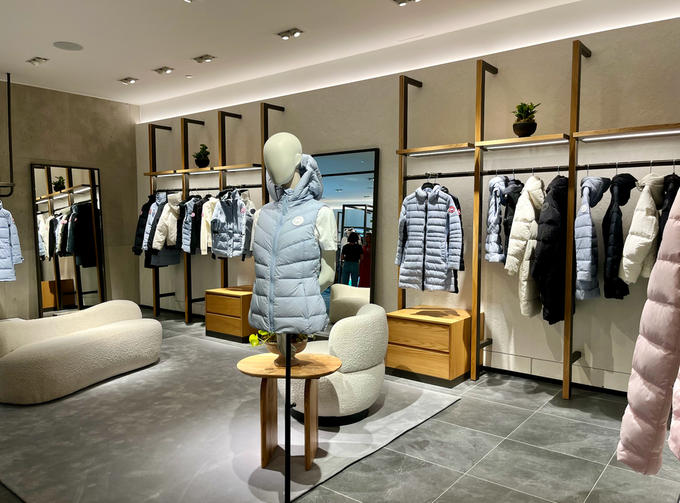 Chez Canada Goose, l'expérience et le confort de la clientèle sont au coeur des préoccupations, tandis qu'on entre dans un espace moderne et épuré où les miroirs et espaces de détente sont nombreux.