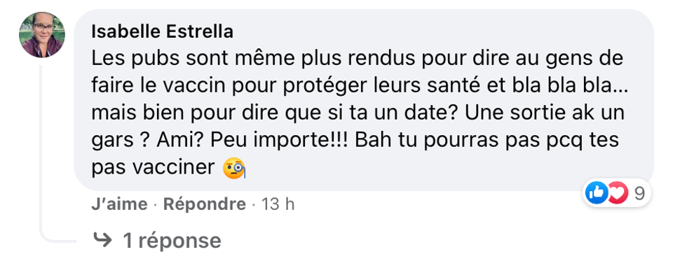 « Les pubs sont même plus rendues pour dire aux gens de faire le vaccin pour protéger leur santé et bla bla bla ... mais bien pour dire que si t'as un date ? Une sortie avec un gars? Un ami ? Peu importe !! Bah tu pourras parce que t'es pas vacciné », soulève cet.te internaute.