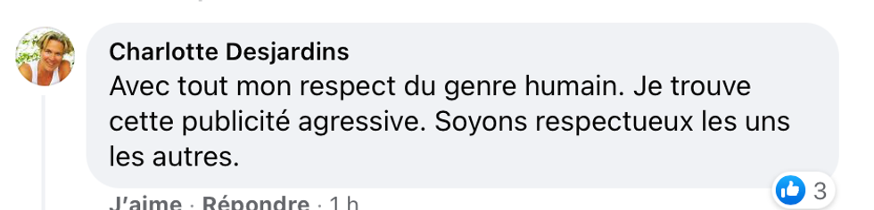 « Avec tout mon respect du genre humain. Je trouve cette publicité agressive. Soyons respectueux les uns les autres », a indiqué ce.tte Québécois.e.