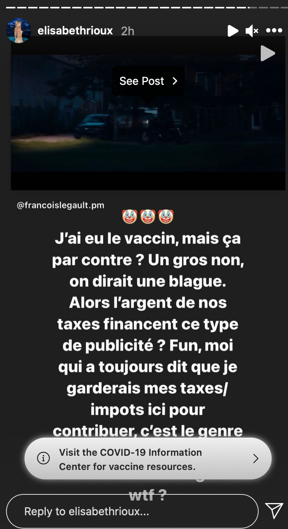 Même l'influenceuse Élisabeth Rioux s'est prononcée dans sa story Instagram sur le sujet : « J'ai eu le vaccin mais ça par contre ? Un gros non, on dirait une blague. Alors l'argent de nos taxes financent ce type de publicité ? Fun, moi qui a toujours dit que je garderais mes taxes/impôts ici pour contribuer, c'est le genre de trucs qui fait douter! Bref au delà de l'argent... WTF ?»