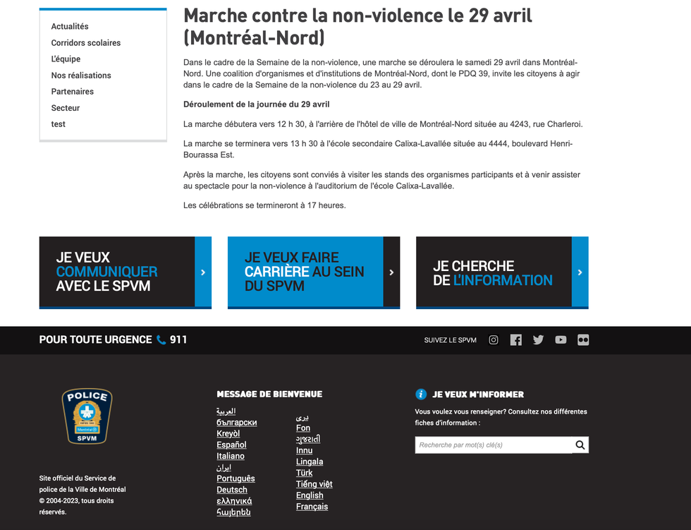 Dans ce communiqué, le SPVM aurait titré : « Marche contre la non-violence le 29 avril (Montréal-Nord) », par erreur, puisqu'il est indiqué en dessous : « Une marche se déroulera le samedi 29 avril dans Montréal-Nord. Une coalition d'organismes et d'institutions de Montréal-Nord, dont le PDQ [NDLR: Poste de quartier] 39, invite les citoyens à agir dans le cadre de la Semaine de la non-violence du 23 au 29 avril ».