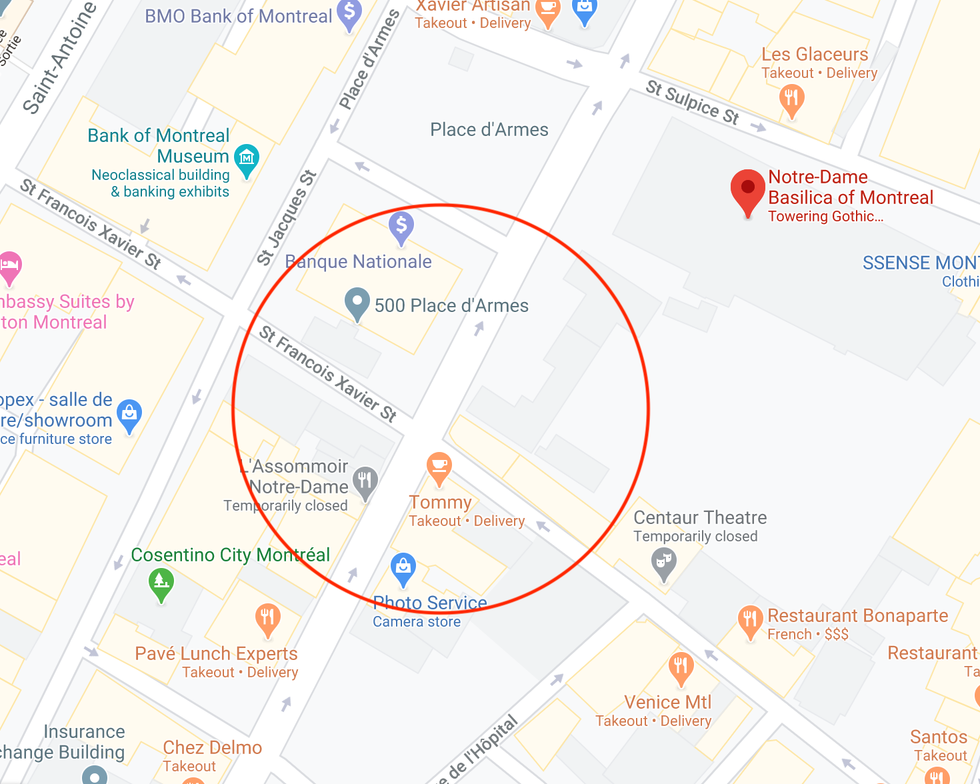 La première agression à l'arme blanche est survenue sur la rue Saint-François, près de Notre-Dame-Ouest, dans l’arrondissement de Ville-Marie, à quelques pas de la Basilique Notre-Dame.