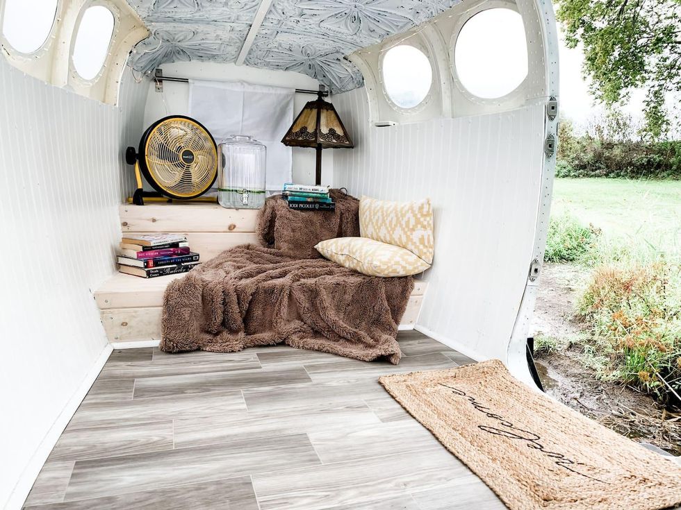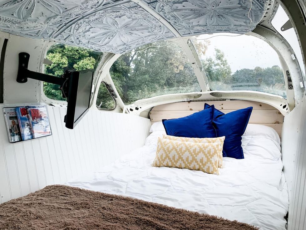 C'est directement à l'avant de l'avion que se trouve la chambre à coucher, dont les fenêtres donnent sur le terrain et sur le cours d'eau où flotte l’appareil. Il y a même une télévision accrochée sur le mur pour s'installer confortablement et écouter un film, que ce soit en cas de pluie ou avant de dormir.