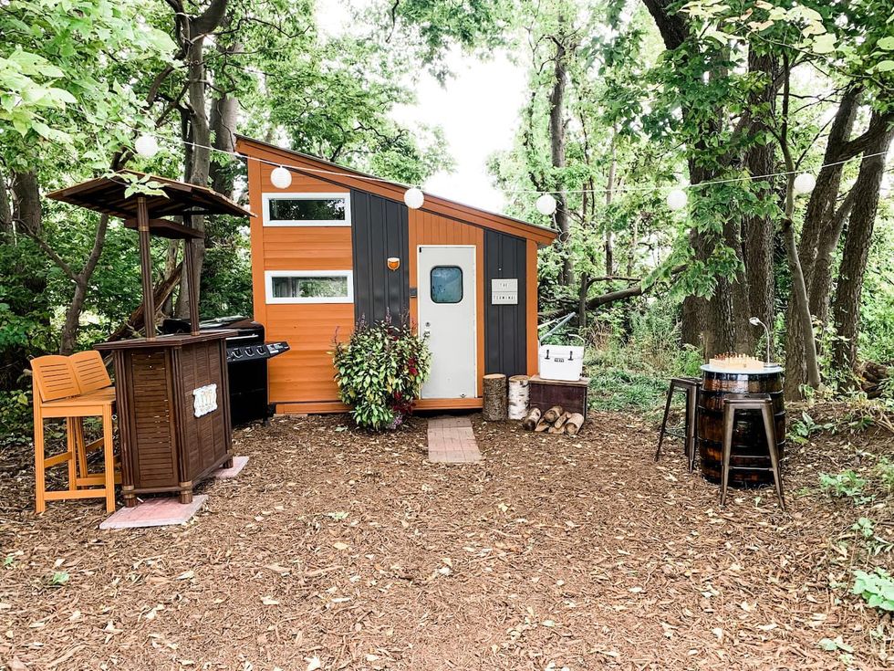 Plus éloignée sur le site se trouve une maisonnette parfaitement aménagée pour subvenir à tes besoins durant le séjour. Elle est entourée d'arbres, d'un hamac, d'un barbecue, d'un petit bar où t'asseoir ou préparer des cocktails ainsi que d'une petite table en forme de baril avec un jeu d'échecs. Il y a même une guirlande de lumières pour ajouter de l'ambiance en soirée.