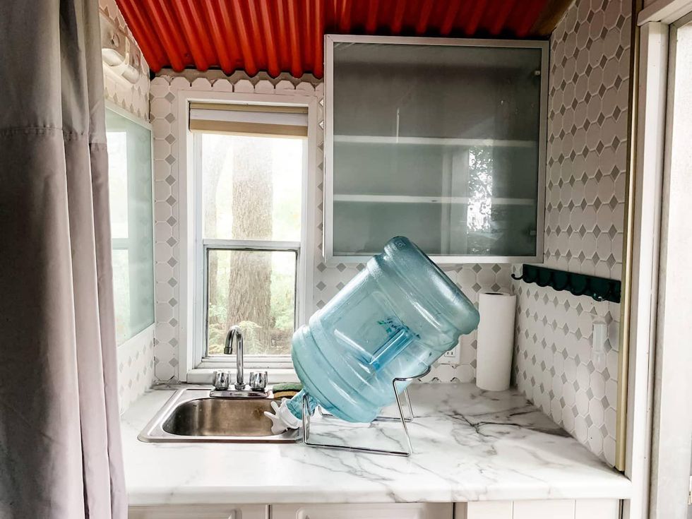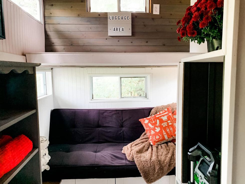 Dans cette petite cabane se trouvent la cuisinette avec un lavabo et des armoires, un petit salon où installer tes bagages, puis une batterie pour charger ton cellulaire, brancher une lampe ou mettre de la musique.