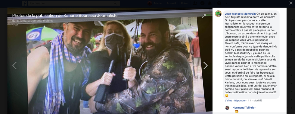 Portant un masque et tentant de respecter la distanciation physique, Kariane Bourassa s'est fait enlacer sans consentement par deux hommes qui manifestaient.