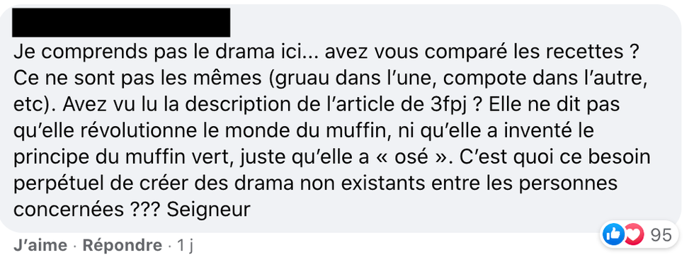 D'autres ont spécifié les différences entre les ingrédients, comme l'usage de gruau ou de compote, et le fait que Trois fois par jour ne stipule nulle part que c'est une recette 100 % originale.