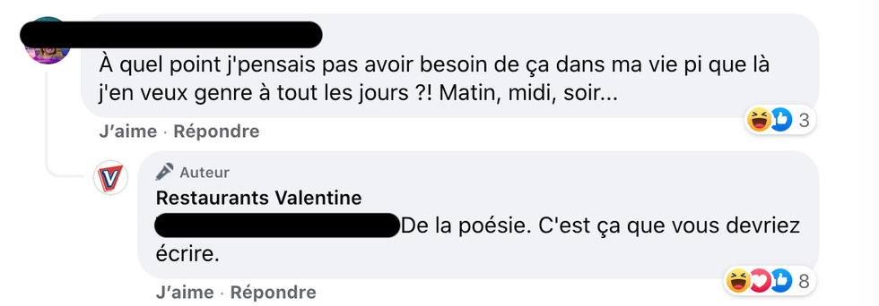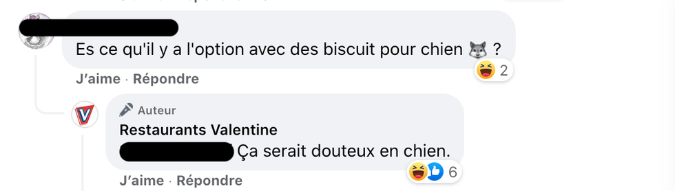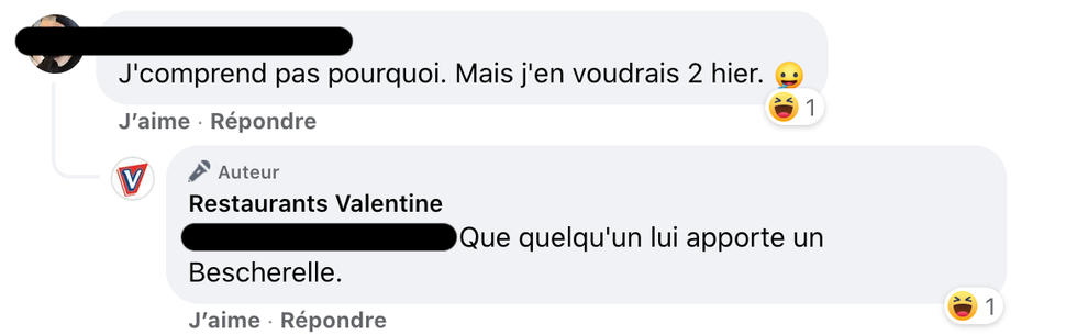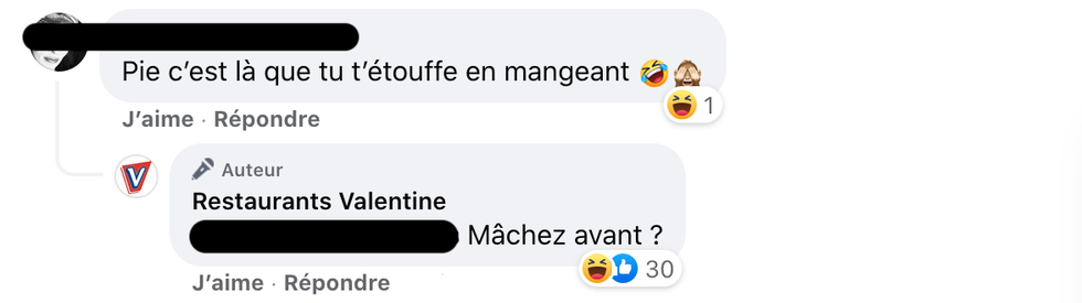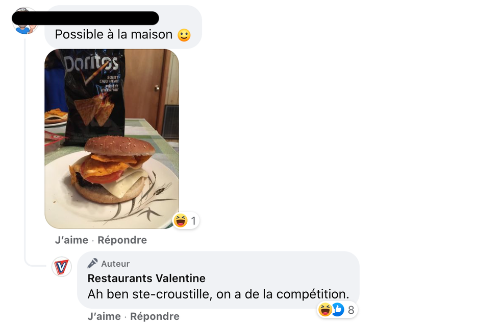 Bien entendu, les restaurants Valentine ne se sont pas empêchés de répondre qu'ils étaient contents de lire ces propos, mais sous d'autres interventions, l'entreprise s'est plutôt permis de rigoler en répliquant avec de petites blagues.