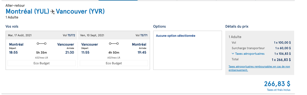 À titre d'exemple, au moment d'écrire ses lignes, des billets à partir de Montréal le 17 août sont offerts à 140 $ avec un vol de retour le 10 septembre à 126 $. Avec les taxes et les frais, le total pour cet aller-retour se détaille à 266,83 $. À noter que des frais de bagages additionnels et de sélection de sièges peuvent s'ajouter, si tu choisis ces options.