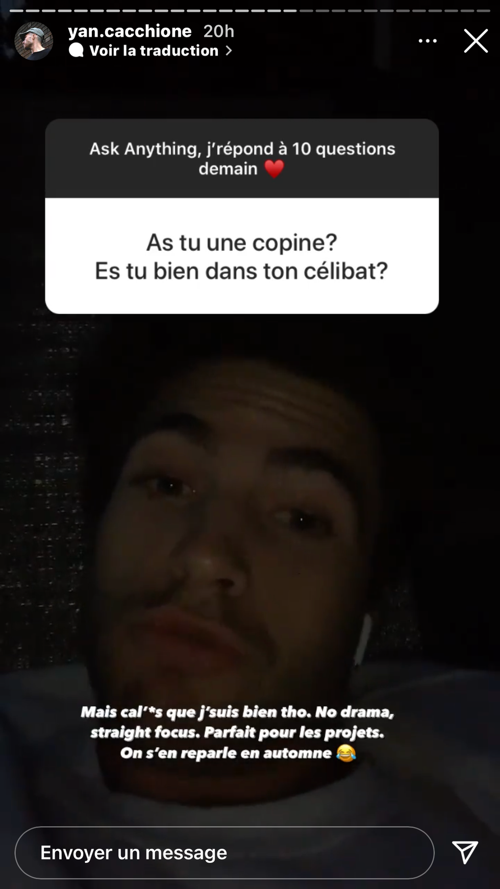 Le 28 juillet, lors d'une séance de questions et de réponses sur son profil Instagram, Yan a répondu à un ou une abonné.e qui demandait s'il avait une copine et s'il était bien dans son célibat. Ce à quoi l'ancien candidat d'OD a répondu :