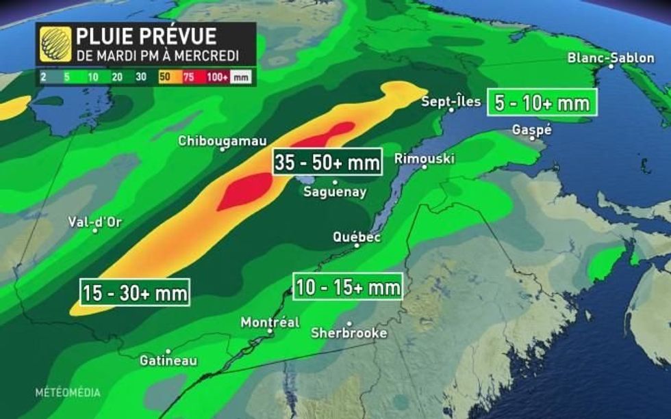 Le Saguenay devrait d'ailleurs recevoir entre 30 et 40 millimètres de pluie entre mardi et mercredi. Un peu plus au nord, ces quantités pourraient même atteindre 75 millimètres.