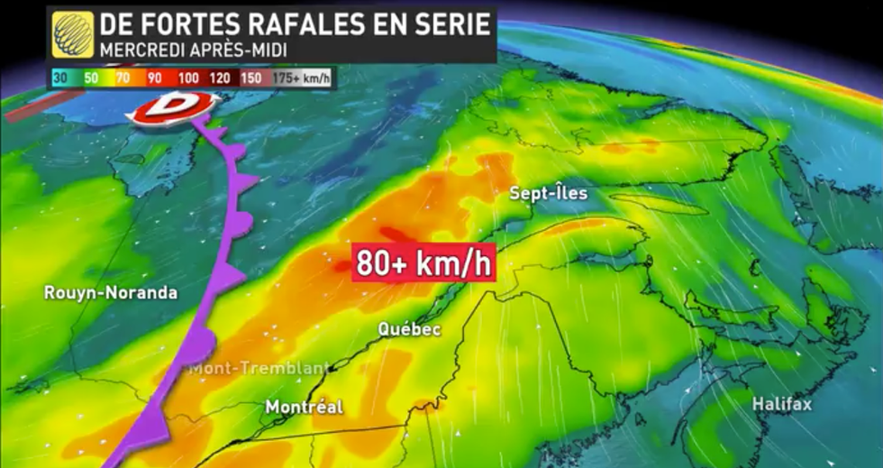 Dans le sud du Québec, dont la région de Montréal, des rafales soufflant jusqu'à 70 km/h sont attendues mercredi.