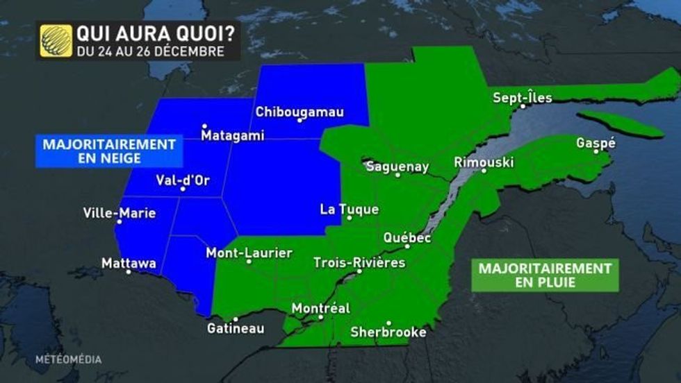 Selon Météomédia, le système arrivera dans le nord-ouest dès le réveillon et « poursuivra ensuite sa course le long du fleuve Saint-Laurent ». La journée même de Noël, le centre de la province sera touché.