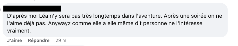 « D'après moi, Léa il ne sera pas très longtemps dans l'aventure. Après une soirée, on ne l'aime déjà pas. Anyways, comme elle a elle-même dit, personne ne l'intéresse vraiment. »
