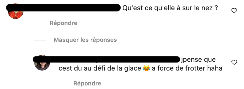 Depuis, les téléspectateurs.trices partagent leur opinion sur la raison de cette blessure qui guérit tranquillement. Plusieurs avaient d'ailleurs évoqué une morsure de froid suite au défi frigorifiant.