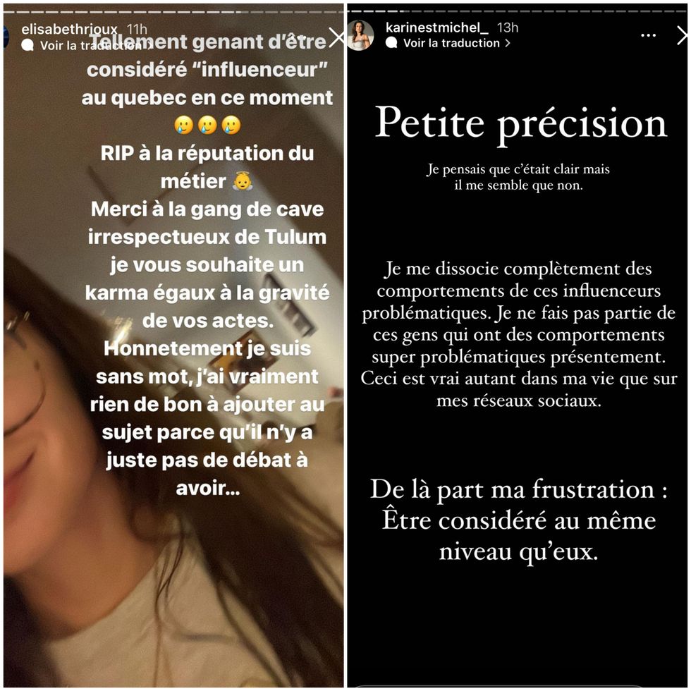 « Tellement gênant d'être considéré "influenceur" au Québec en ce moment. RIP à la réputation du métier. Merci à la gang de c**es irrespectueux de Tulum. Je vous souhaite un karma égal à la gravité de vos actes. Honnêtement je suis sans mot, j'ai vraiment rien de bon à ajouter au sujet parce qu'il n'y a juste pas de débat à avoir... », a notamment souligné Élisabeth Rioux.