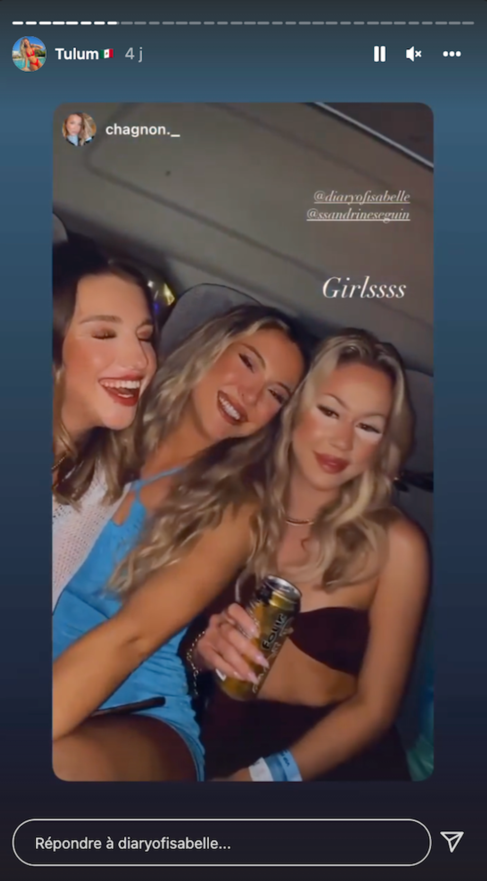 « Il y a des photos puis il y a une fille qui me ressemble comme deux gouttes d'eau dans une des photos, mais c'est pas moi. Moi, Sandrine pis Anna on était assises les trois, on a même fait un TikTok [...], fait que c'est pas moi qui étais debout en train de sourire pis d'avoir du fun. On était assises puis en plus, les trois on avait passé la veille ensemble puis on était brûlées mortes, on était couchées, on dormait. [...] »