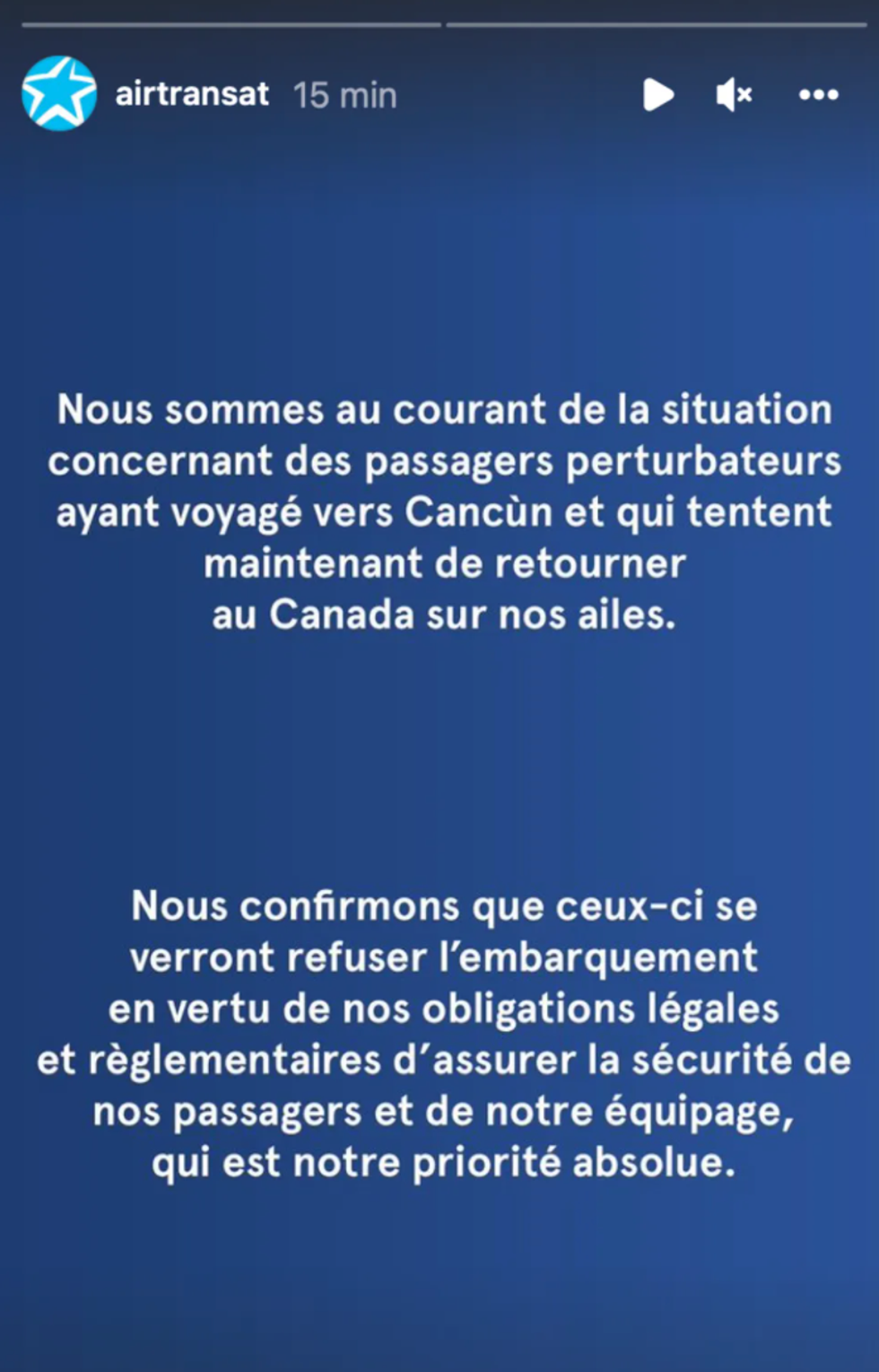 « Nous sommes au courant de la situation concernant des passagers perturbateurs ayant voyagé vers Cancún et qui tentent maintenant de retourner au Canada sur nos ailes. Nous confirmons que ceux-ci se verront refuser l'embarquement en vertu de nos obligations légales et réglementaires d'assurer la sécurité de nos passagers et de notre équipage, qui est notre priorité absolue », a indiqué Air Transat en story sur son compte Instagram.