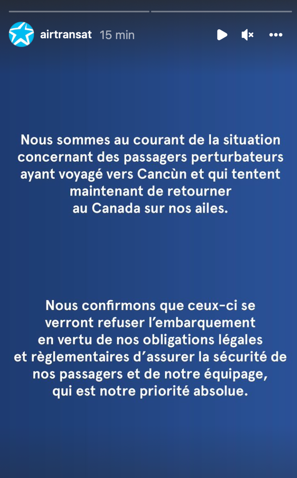 « Nous sommes au courant de la situation concernant des passagers perturbateurs ayant voyagé vers Cancún et qui tentent maintenant de retourner au Canada sur nos ailes. Nous confirmons que ceux-ci se verront refuser l'embarquement en vertu de nos obligations légales et réglementaires d'assurer la sécurité de nos passagers et de notre équipage, qui est notre priorité absolue », a indiqué Air Transat en story sur son compte Instagram.