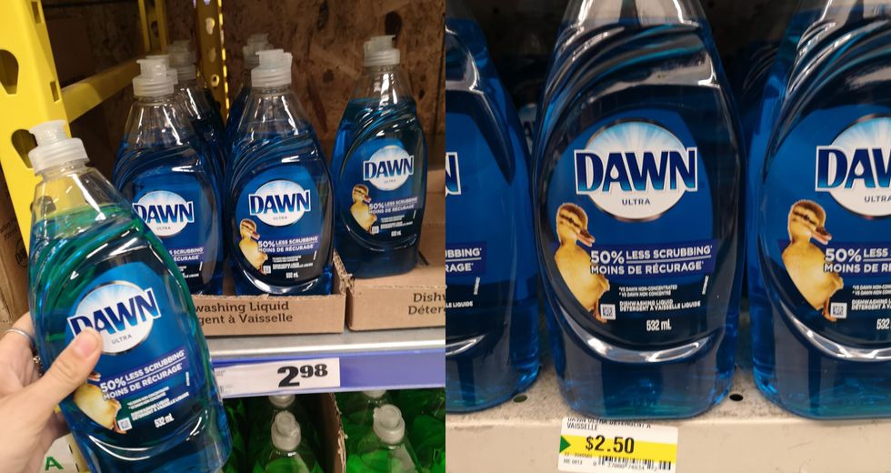 Détails : Un 50 sous de différence alors qu'il s'agit exactement du même produit, ce n'est pas rien! Ça vaut la peine de faire le plein de savon à vaisselle.
