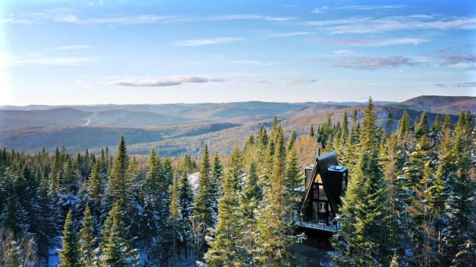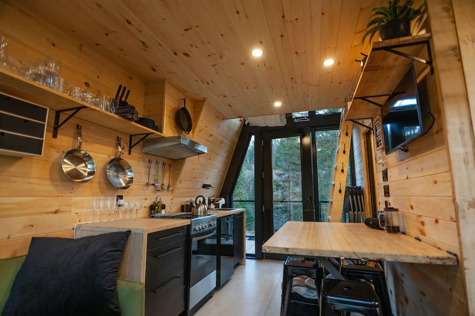 Cette micromaison se trouve à Lac-Beauport et elle peut accueillir jusqu'à quatre visiteurs et visiteuses dans son architecture en forme de A.
