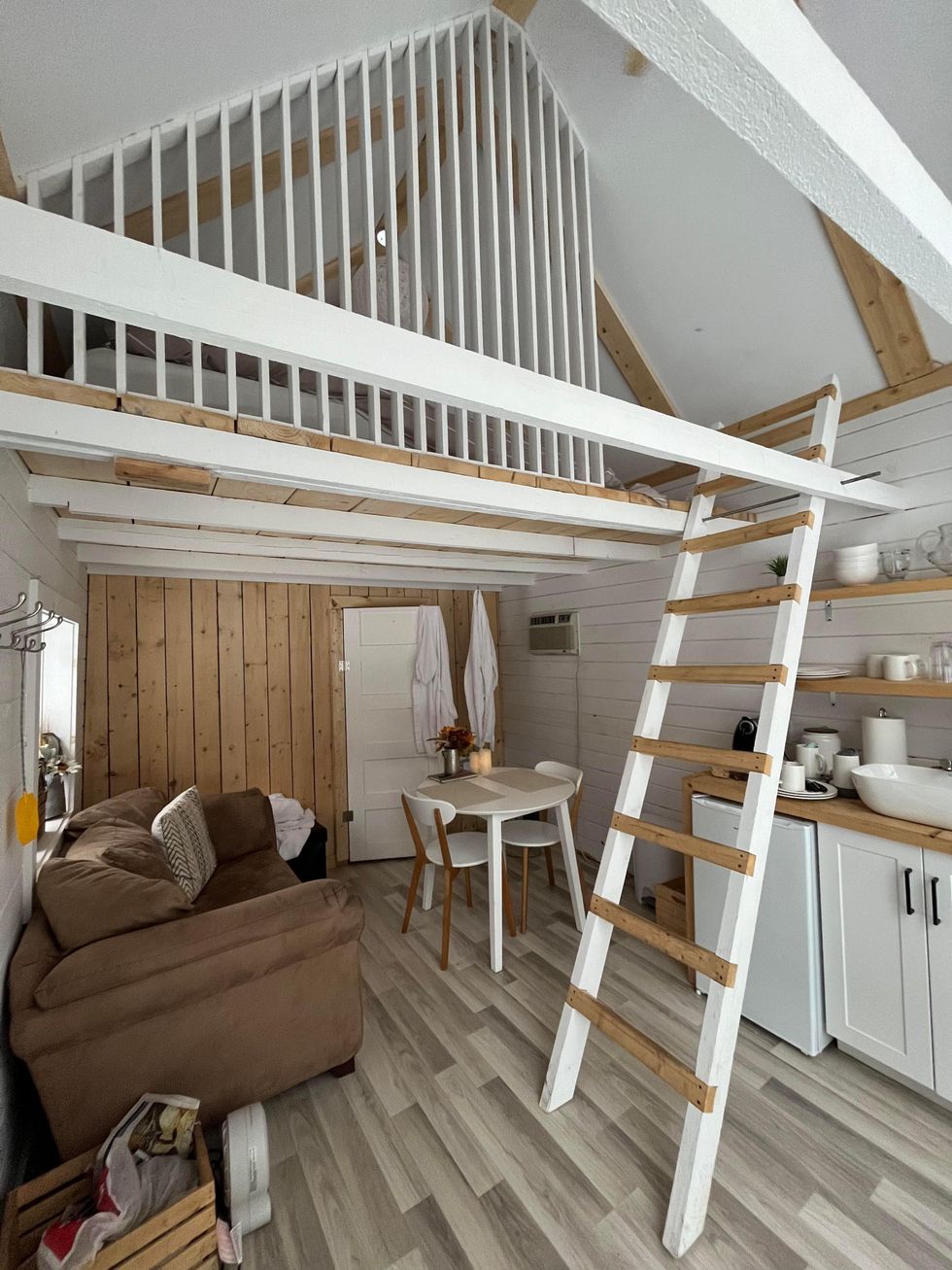L'intérieur des plus cozy, accueillant et instagrammable comprend une petite cuisine toute équipée, un espace pour manger ainsi qu'un divan. Lors de ta visite, tu pourras même te servir de quelques jeux de société mis à la disposition des voyageur.ses et te préparer un délicieux café, également offert avec la location.