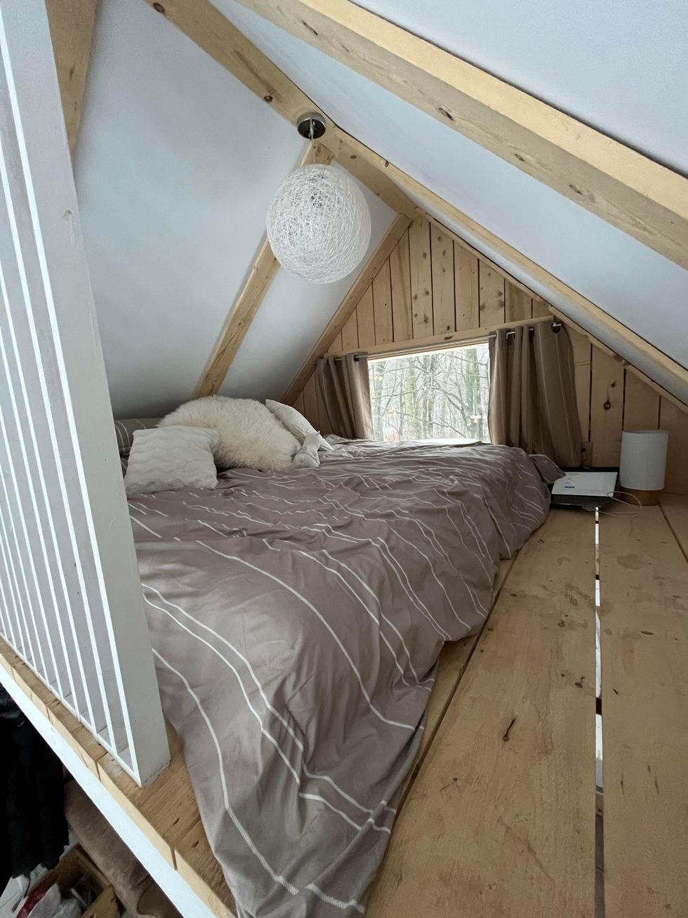 Pour accéder à la chambre à coucher qui se trouve sur la mezzanine, il faut faire descendre une échelle du plafond. Un lit taille king, une tonne de coussins et une fenêtre habillent l'espace.