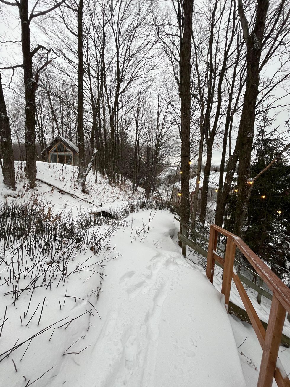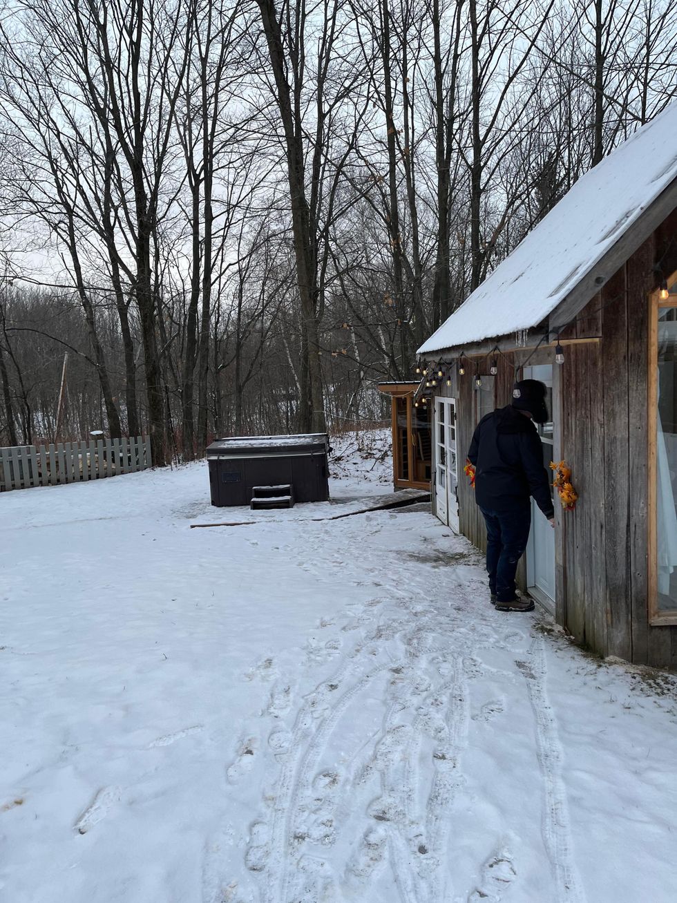 Sur le terrain, tu as même accès à un spa et un sauna privés (eh oui, les serviettes ainsi que les peignoirs sont déposés dans la cabane), à un coin pour des feux de camp, beaucoup de bois ainsi qu'un grand espace entouré d'arbres matures où te balader, peu importe la saison.