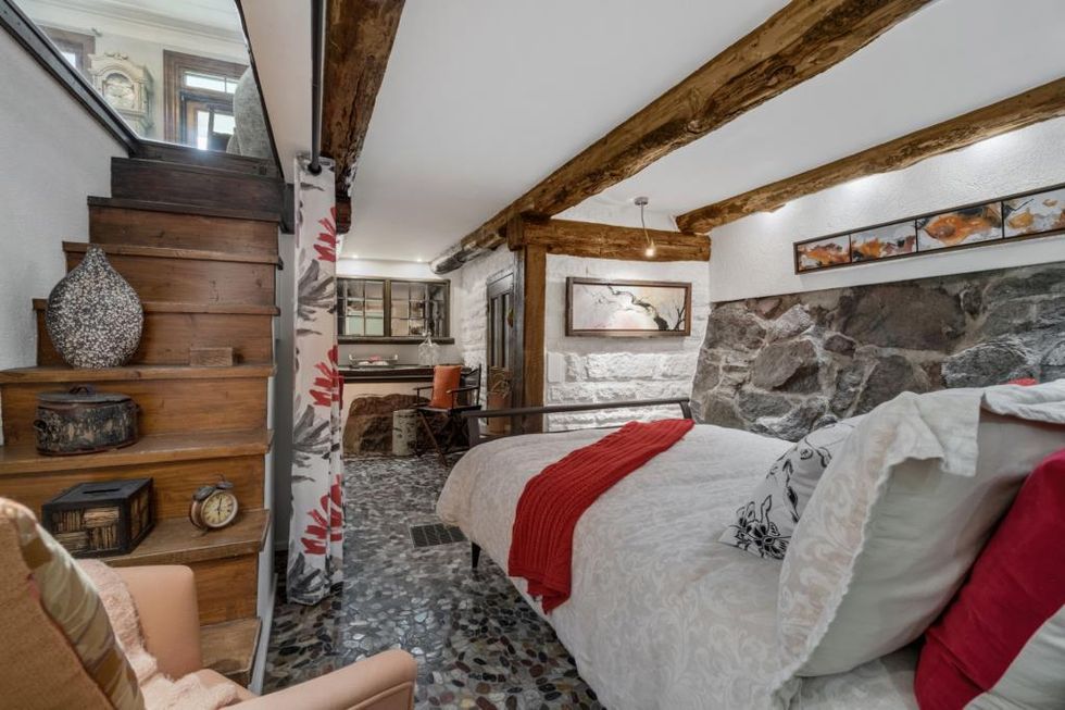 Au sous-sol, c'est l'espace réservé aux invité.es avec deux chambres et une cave à vin. Ces pièces ont des murs de pierres, ce qui accentue le caractère unique du décor.