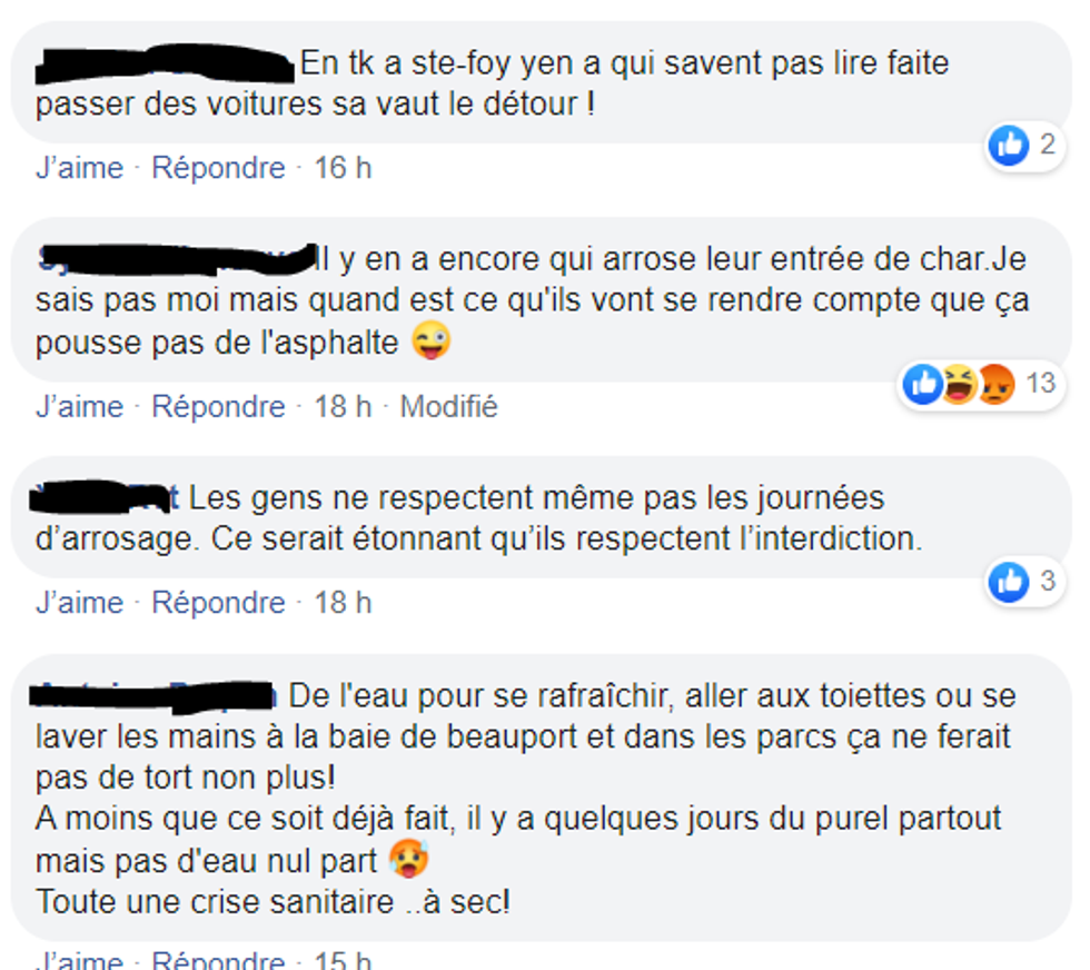 « La ville de Québec demande de ne pas gaspiller l'eau, le voisin a laver ses deux autos et l'autre a arroser son gazon », a écrit cet internaute.