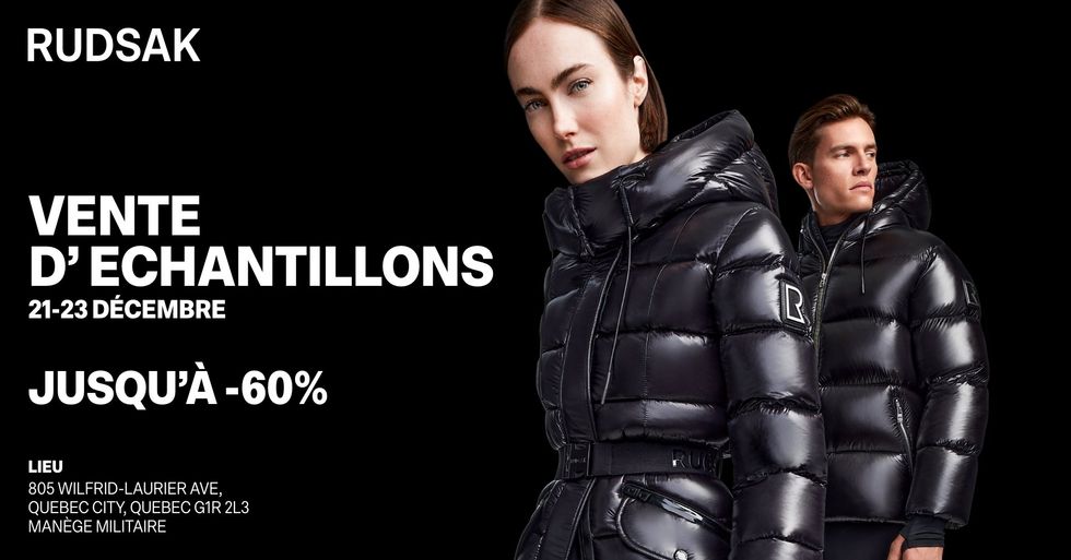 Si tu es encore à la recherche de tes cadeaux ou s'il te faut un nouveau manteau pour survivre à l'hiver, la vente d'échantillons RUDSAK est là. Les portes sont ouvertes de 10h à 21h jeudi et vendredi, et jusqu'à 17h samedi au Manège militaire de Québec.