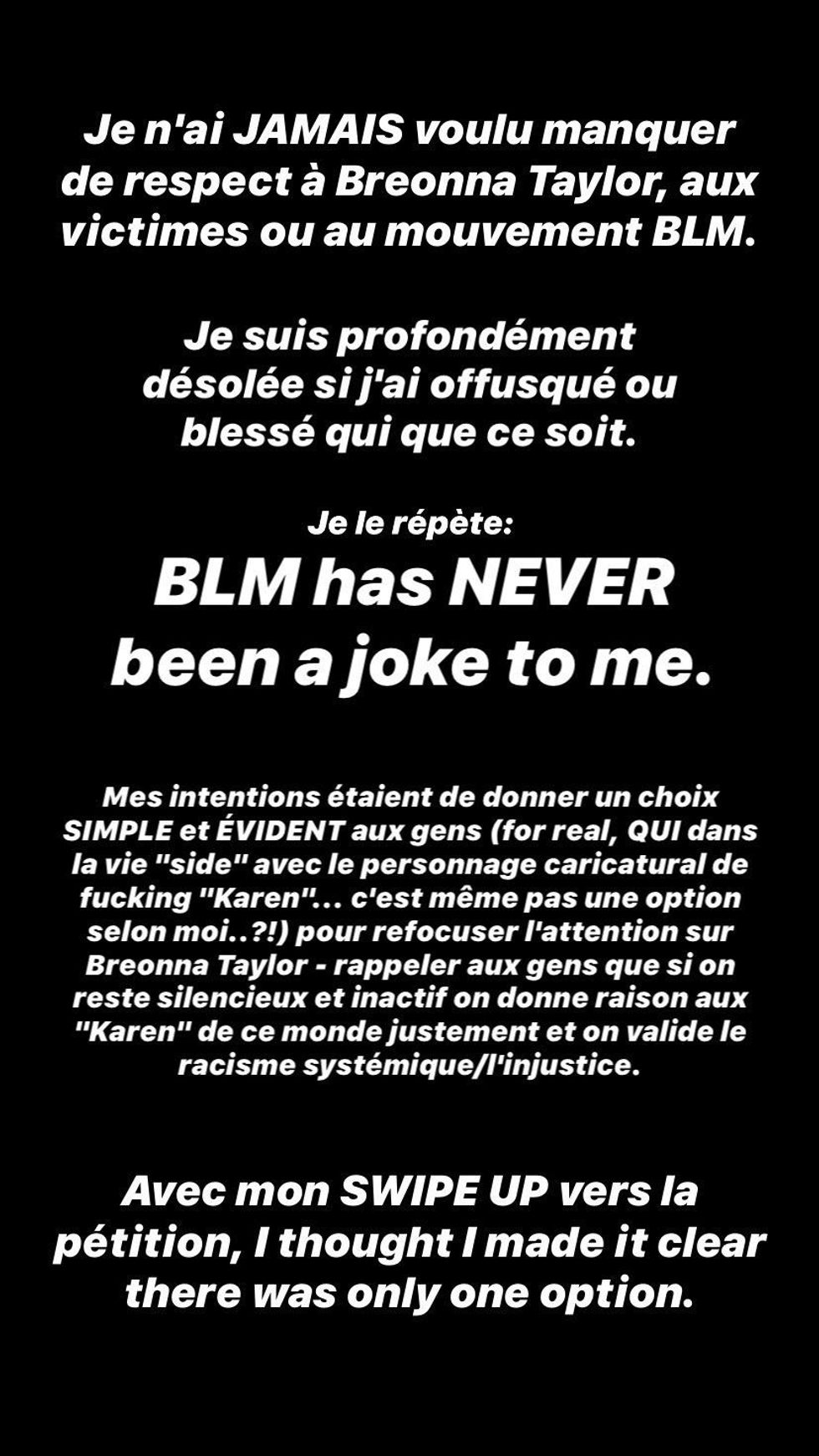« Je comprends le point de vue. Toutefois, sachez que j'ai toujours été activement impliquée dans le mouvement Black Lives Matter. It has NEVER been a joke to me. J'ai mis comme option "Karen" par ironie, parce que [qui voterait pour Karen]???