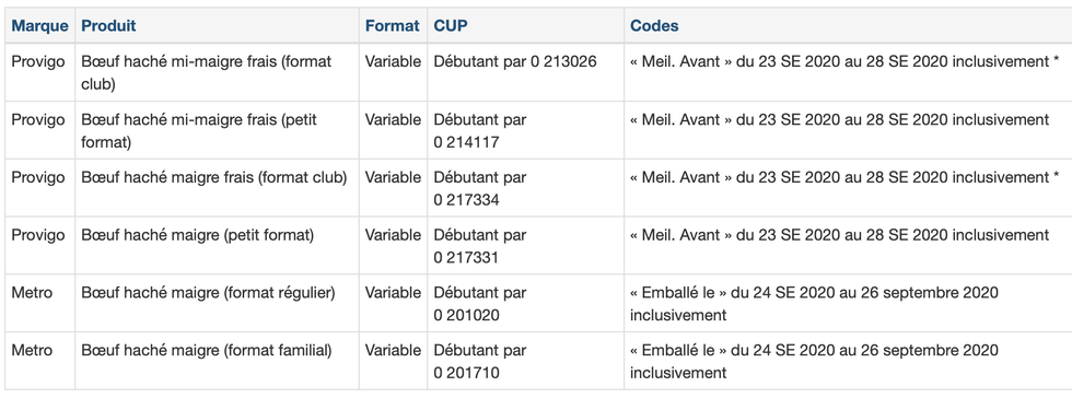 - Bœuf haché maigre (petit format) Provigo, CUP débutant par 0 217331, codes « Meil. Avant » du 23 septembre 2020 au 28 septembre 2020 inclusivement.