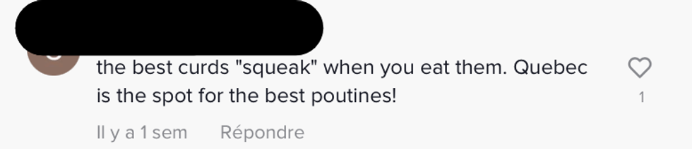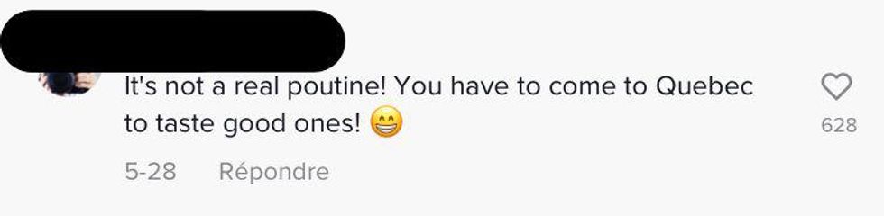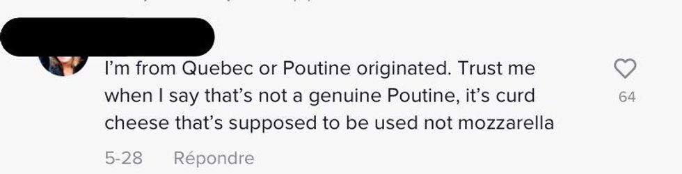 « Je viens du Québec, de là où la poutine vient. Crois-moi quand je dis que c'est pas une véritable poutine. C'est censé être du fromage en grains et pas de la mozzarella », ajoute ce.tte Québécois.e.