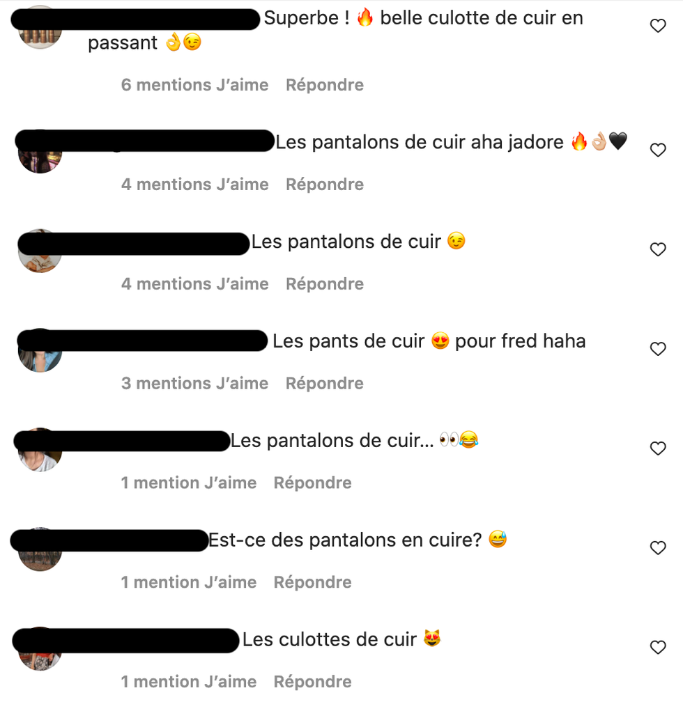 « Je vais me permettre de démystifier le mystère du pantalon en cuir. Donc non, malheureusement, j'ai fait le choix de mon style vestimentaire en fonction de mes propres envies. I guess qu'il faut que je brûle mon manteau aussi ou sinon ça va partir une rumeur parce qu'il est en cuire lui aussi, câline. »