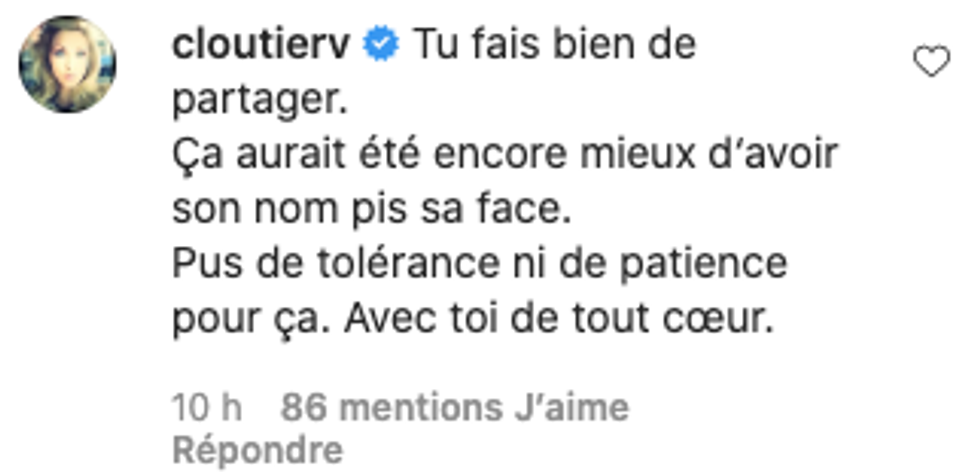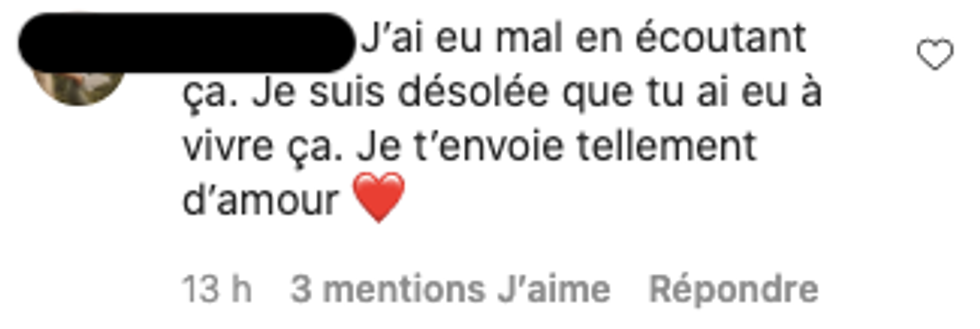 La majorité des commentaires sous sa dénonciation se veulent une marque d'appui envers elle et ce qu'elle vit actuellement, mais aussi un espace où elle est invitée à demeurer courageuse.