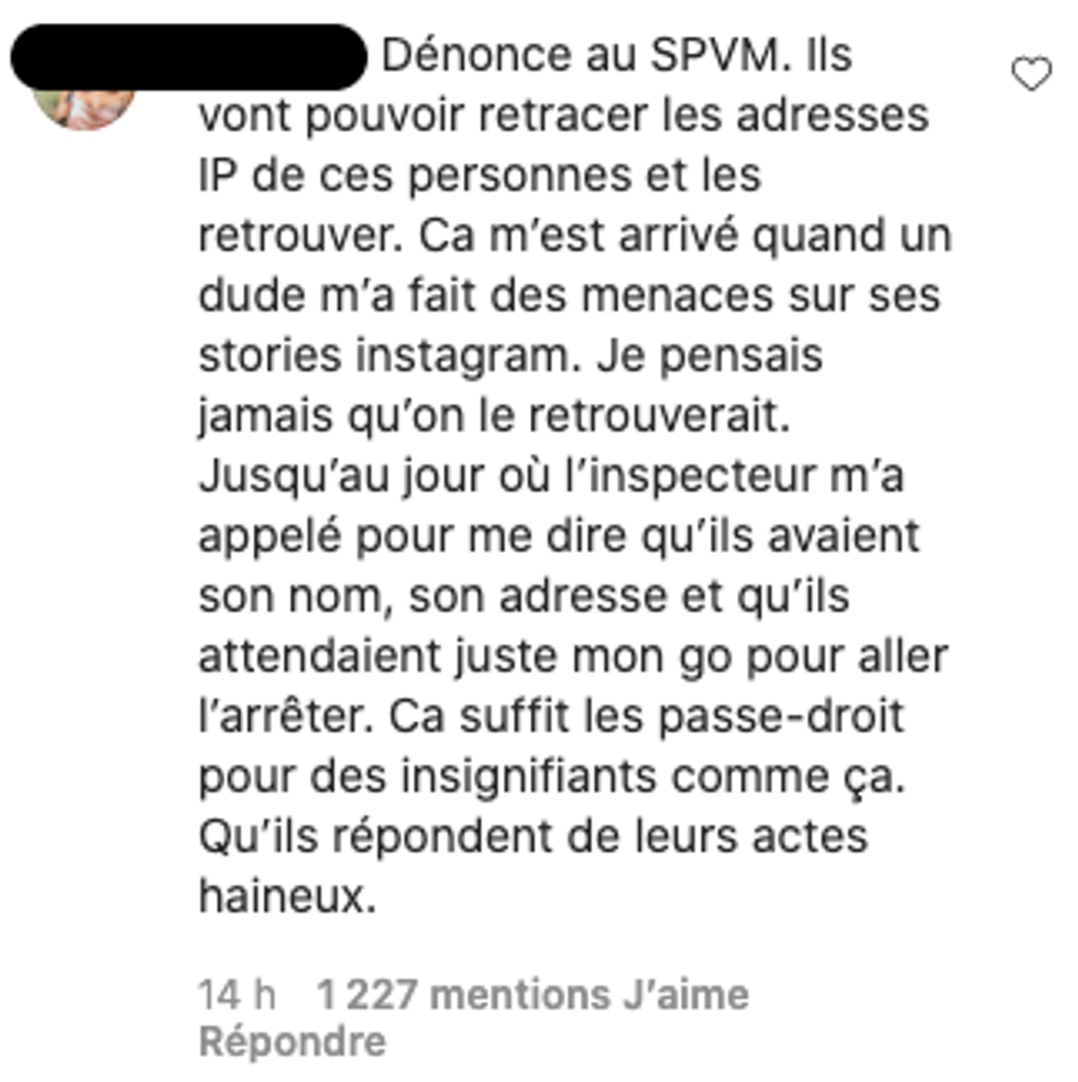 Certains l'invitent à faire une plainte, dont le commentaire ci-dessous qui rapporte une expérience similaire avec des menaces sur Instagram. Le fait d'avoir contacté les autorités aurait porté fruit dans son cas.