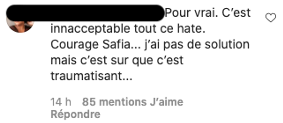 Dans son message, Safia explique qu'elle s'est sentie traumatisée par les événements sur le coup et des Québécois compatissent avec ce qu'elle a vécu.