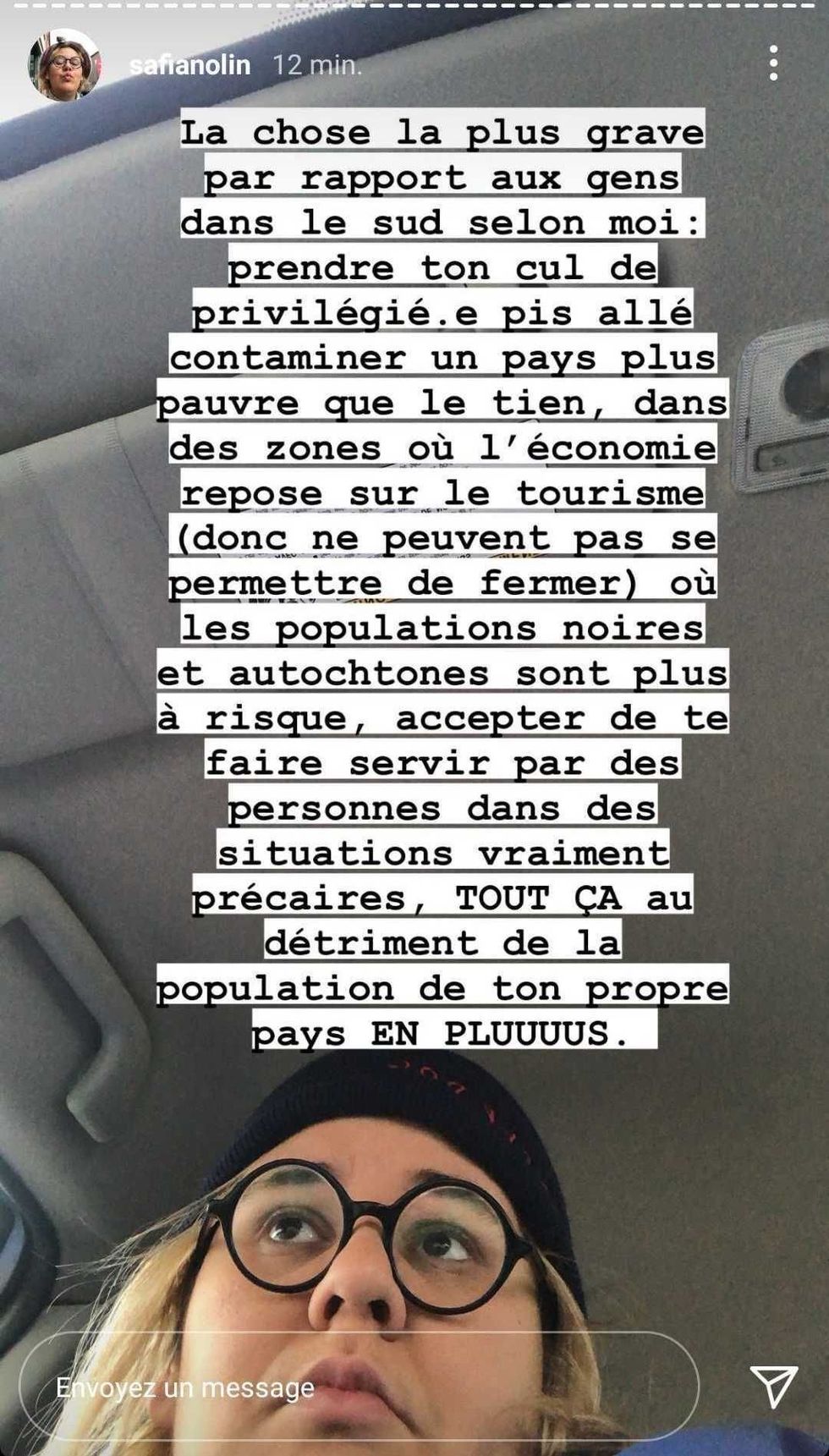 Selon Safia, la chose la plus grave serait de profiter de ses privilèges et visiter des lieux moins favorisés en allant « contaminer un pays plus pauvre que le tien, dans des zones où l'économie repose sur le tourisme (donc ne peuvent pas se permettre de fermer) ».