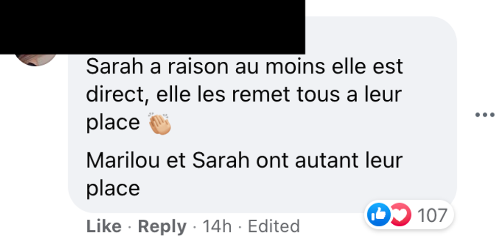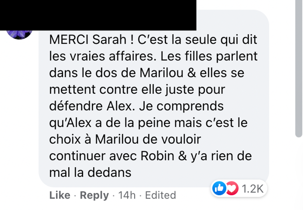 D'autres fans ont tenu à souligner le fait que Sarah-Donia soit la seule à défendre Marilou en disant qu'elle a le droit de vivre son histoire avec Robin sans le jugement des autres. Plusieurs ont mentionné qu'elle était la plus mature et qu'elle et Marilou méritaient leurs places.