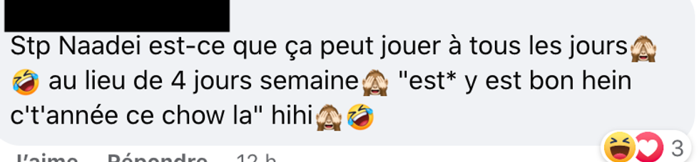 « ... est-ce que ça peut jouer à tous les jours au lieu de quatre jours semaine? ''Est* y est bon hein c't'année ce [show] là'' hihi. »