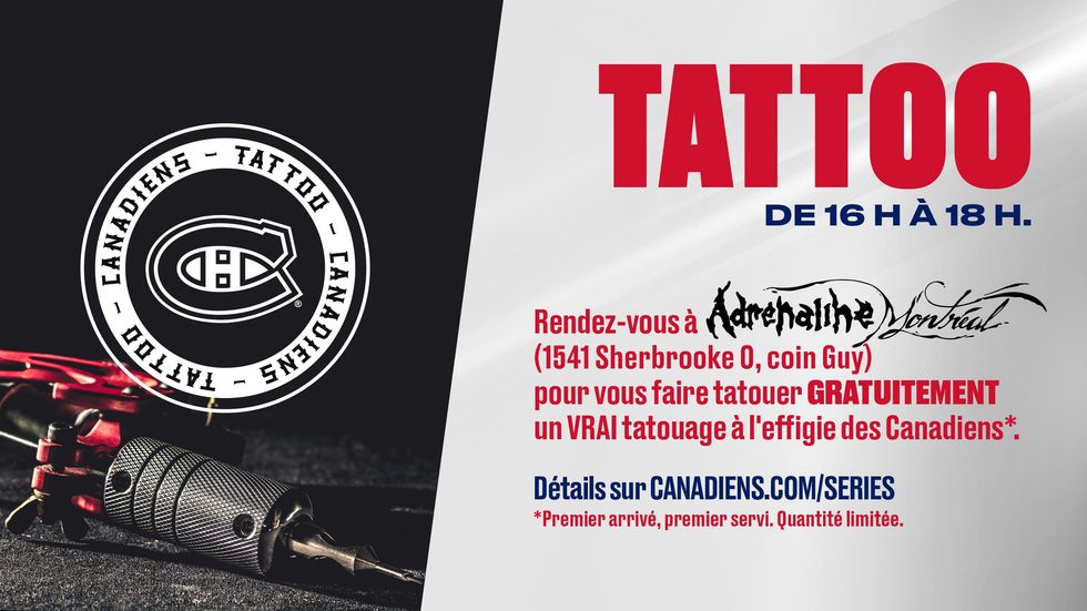 De 16 h à 18 h (HNE) lors de chaque match (à domicile ou à l'extérieur), les inconditionnel.le.s des Canadiens auront la possibilité de se faire faire gratuitement un tatouage à l'effigie de l'équipe chez Adrenaline, situé au centre-ville de Montréal, au 1541 de la rue Sherbrooke Ouest.
