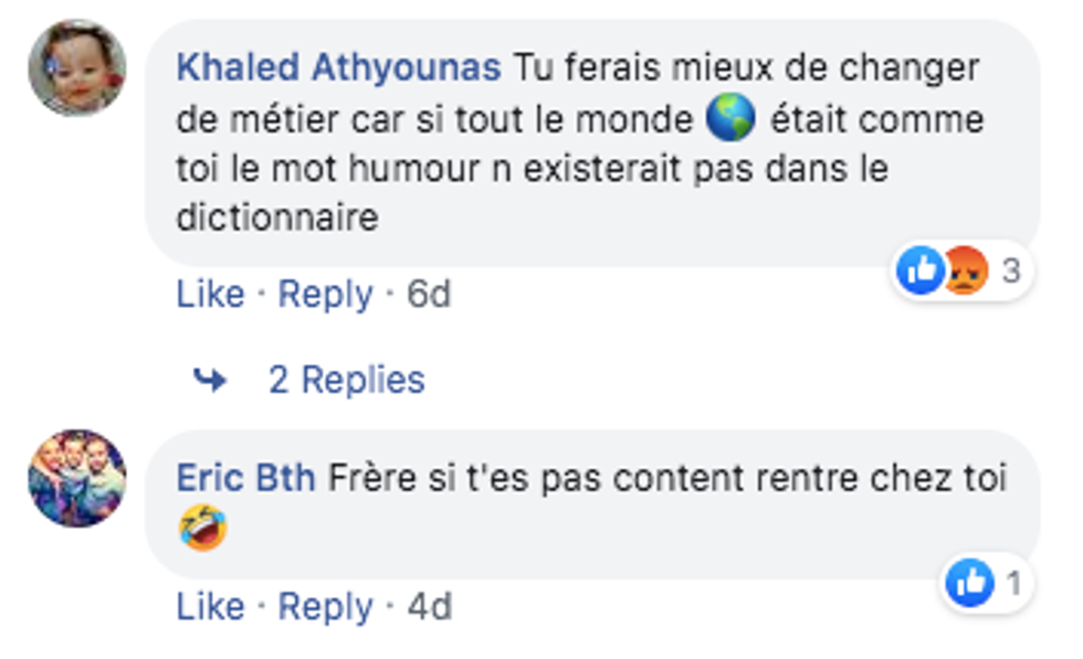Certaines personnes suggèrent entre autres à Sugar Sammy de « rentrer chez lui » et ne semblent pas particulièrement apprécier l'humour de l'homme originaire de Montréal.
