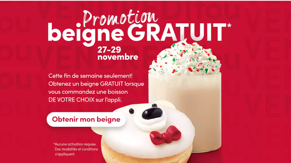 À noter qu'il y a une limite d'un seul beigne gratuit par commande, peu importe le nombre de boissons achetées. Tu peux toutefois passer plusieurs commandes pendant la fin de semaine.