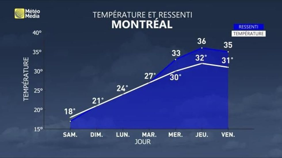 Les nuits risquent aussi d'être très chaudes et humides. À Montréal, on pourra ressentir 23 degrés dans la nuit du 18 au 19 juin.