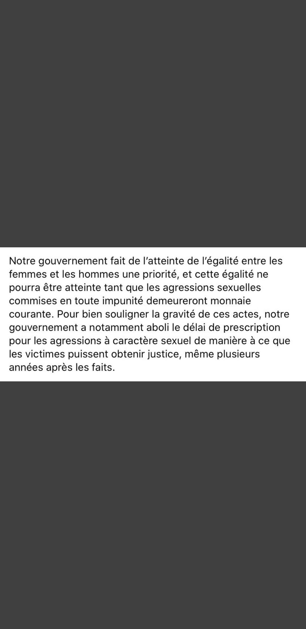 Elle rappelle ensuite que le gouvernement Legault a mis fin au délai de prescription pour les agressions à caractère sexuel, permettant ainsi aux victimes d'avoir recours à la justice quand elles le désirent, même longtemps après les faits.