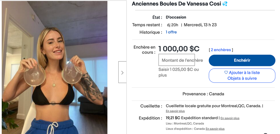Pour ce qui est de ses anciens implants, elle les a mis en enchère sur eBay et, au moment d'écrire ces lignes, le montant est à 1000 $ en plus d’un frais de 19,21 $ pour la livraison. L'enchère se termine le mercredi 7 septembre et deux bids ont été placés, ce qui veut dire qu'un.e heureus.es élu.es pourras mettre la main sur les « anciennes boules » de Vanessa. Elle peut donc leur dire adieu, et avoir un petit retour sur le prix de son opération, qui était de 11 400 $ et des poussières.