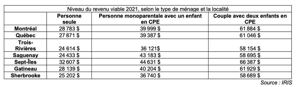 L'Institut de recherche et d'informations socioéconomiques (IRIS) a publié ce mercredi 28 avril sa plus récente édition du Revenu viable, qui s'attarde sur sept villes du Québec, soit Montréal, Gatineau, Québec, Saguenay, Sept-Îles, Sherbrooke ou Trois-Rivières.